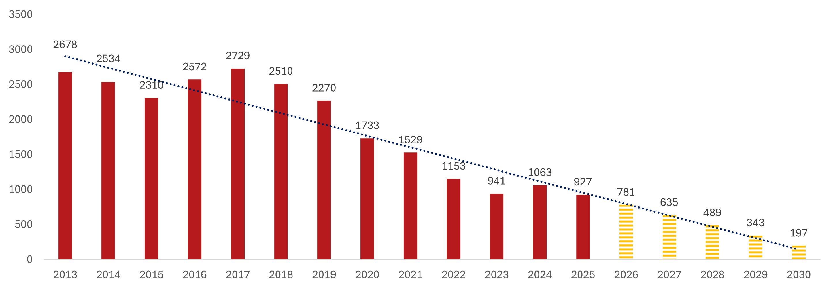 Diagrammet visar antalet stölder sedan 2013 och framåt. Antalet stölder för 2026–2030 är en prognos baseras på en genomsnittlig minskning av 146 motorer per år.
