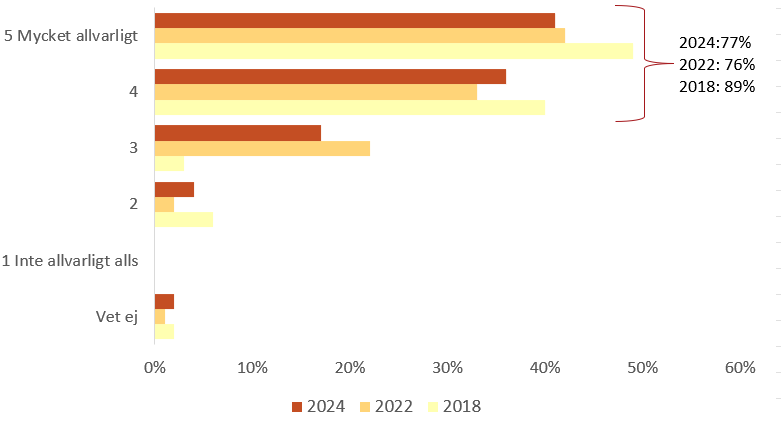 27 februari 2024Vid undersökningen framgick att 77 procent ansåg att försäkringsbedrägeri är ett allvarligt brott. Det var en viss minskning jämfört med tidigare mätningar som gjorts. Åldersgruppen 50–64 år (86 %) och 65–84 år (94 %) ansåg i högre grad att försäkringsbedrägeri är ett allvarligt brott.