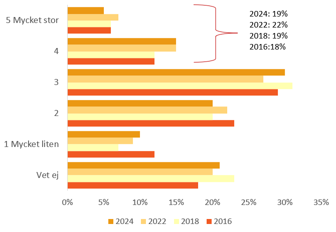 Diagrammet visar svaret på frågan: Hur stor eller liten tror du att risken är för att åka fast om du begår ett försäkringsbedrägeri?